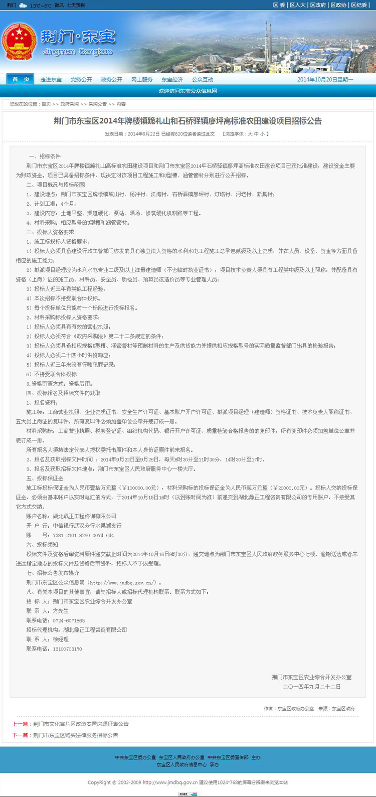 荊門市東寶區2014年牌樓鎮跪禮山和石橋驛鎮廖坪高標準農田建設項目