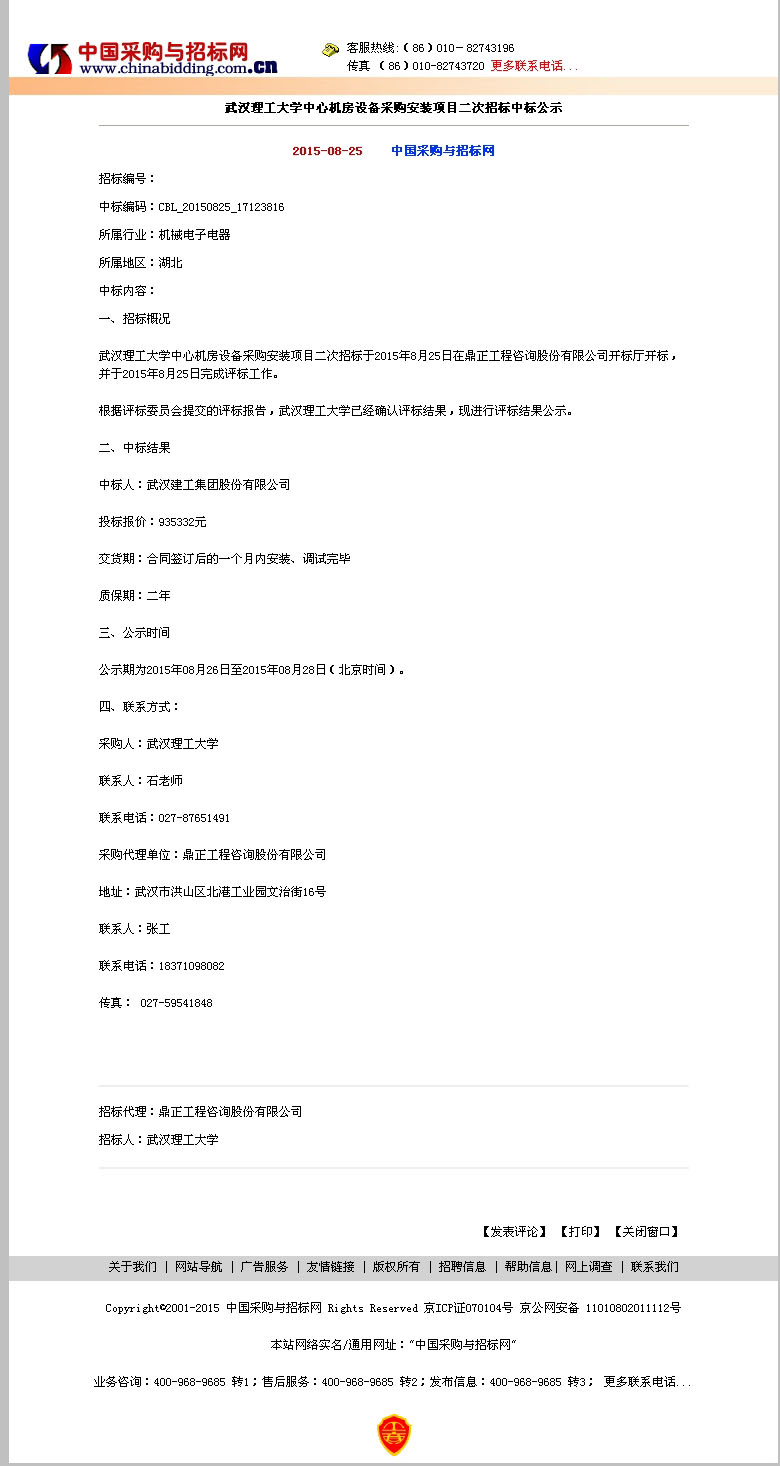 武漢理工大學(xué)中心機(jī)房設(shè)備采購安裝項(xiàng)目二次招標(biāo)中標(biāo)公示