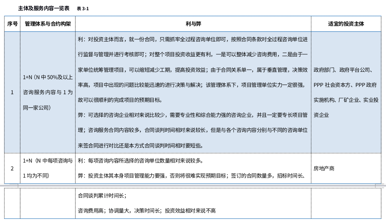 不同的投資主體所需的服務內容和管理模式不一樣,就會導致項目管理體系上和合約構架上不一樣,以下通過表格闡述不同的管理體系和合約構架的利與弊及適宜的投資主體(本文倡導的全過程咨詢以項目管理為主線,用1表示,前期咨詢、監理、造價、招標代理、勘察設計管理等用N表示):