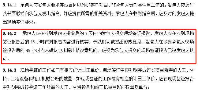 此外,第9.14.2條中,“......發(fā)包人在收到承包人現(xiàn)場(chǎng)簽報(bào)告后的48小時(shí)內(nèi)未確認(rèn)也未提出修改意見的,應(yīng)視為承包人提交的現(xiàn)場(chǎng)簽證報(bào)告已被發(fā)包人認(rèn)可。”即,從時(shí)限來講,“48小時(shí)”亦非能夠滿足發(fā)包方充分詢價(jià)并與承包方定價(jià)的時(shí)長(zhǎng)。
