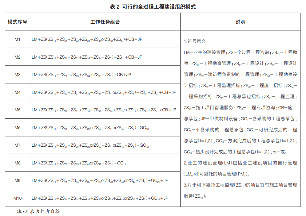 國家鼓勵多種形式的全過程工程咨詢服務模式,服務內容可以是跨階段組合或同一階段內不同類型的組合。據筆者調查,目前業界認可度較高的全過程工程咨詢內容主要包括勘察設計、招標采購、監理與施工項目管理服務以及工程專項咨詢。其中,工程勘察設計咨詢分為工程勘察設計和勘察設計管理服務兩種類型;工程專項咨詢包括項目融資、工程造價、信息技術等業主所需求的咨詢服務。基于這一認識,筆者梳理了建設、勘察設計、監理、施工等單位在工程建設中的關系組合,并列出工程建設全過程主要的建設組織模式,如表2所示。