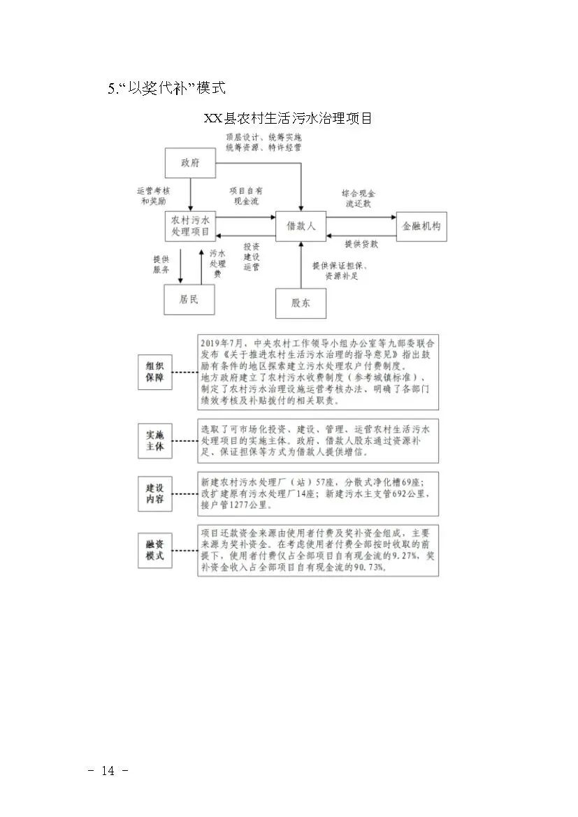 (五)多措并舉,創新模式。地方政府統籌安排,為符合條件的項目爭取多元化的資金,豐富項目資金籌措渠道。鼓勵支持市場化方式運營的項目,包含政府與社會資本合作(PPP)、特許經營,以及環境綜合治理托管、環境污染第三方治理、生態環境導向的開發(EOD)等模式。