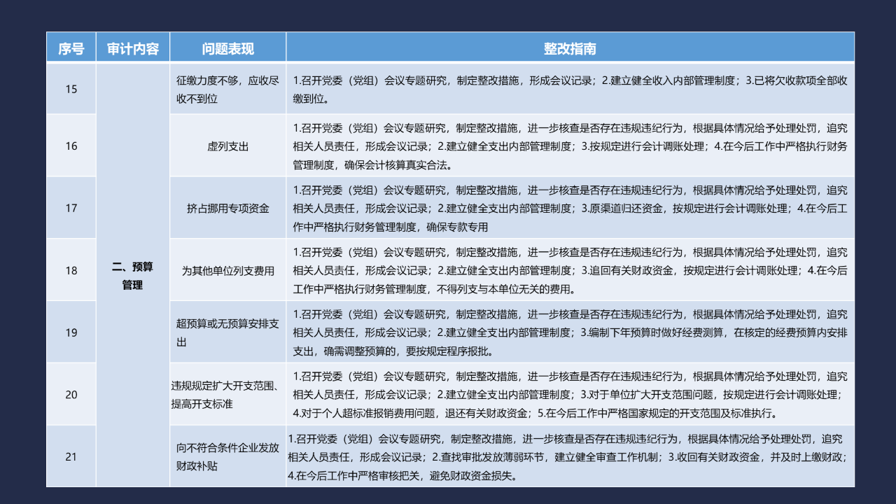 《整改指南100條》僅對審計整改的認定提供一般參考,每個問題的具體整改要求由審計機關在此基礎上依據審計事實、問題情節、產生后果,在審計報告及所附的《審計發現問題清單》中予以明確。涉及上級審計查出問題的整改情況按照上級審計機關有關要求進行落實。