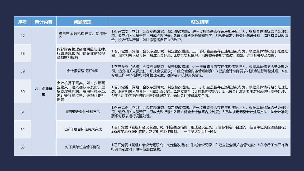 《整改指南100條》僅對審計整改的認定提供一般參考,每個問題的具體整改要求由審計機關在此基礎上依據審計事實、問題情節和產生后果,在審計報告中予以明確。涉及上級審計查出問題的整改情況按照上級審計機關有關要求進行落實。