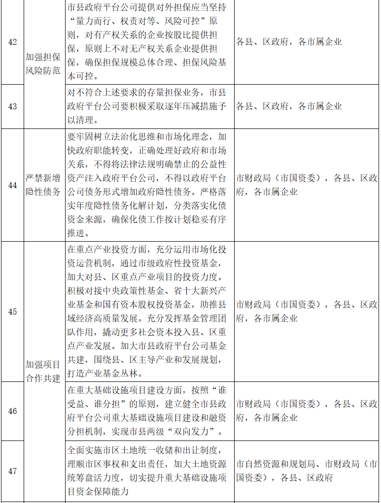 16.嚴禁新增隱性債務。要牢固樹立法治化思維和市場化理念,加快政府職能轉變,正確處理好政府和市場關系。不得將法律法規明確禁止的公益性資產注入政府平臺公司,不得以政府平臺公司債務形式增加政府隱性債務。嚴格落實年度隱性債務化解計劃,分類落實化債資金來源,確保化債工作按計劃穩妥有序推進。〔責任單位:市財政局(市國資委),各縣、區政府,各市屬企業〕