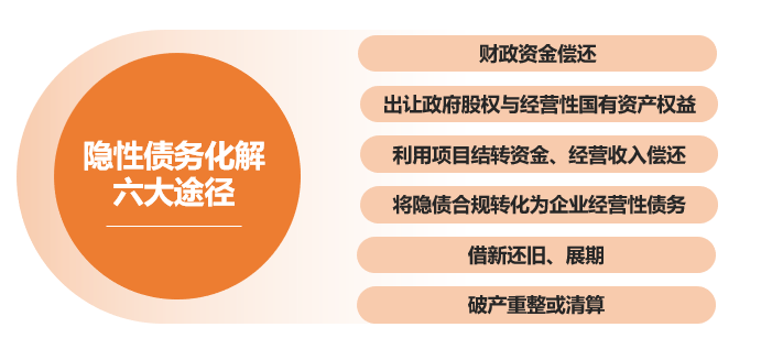 根據(jù)2018年8月財(cái)政部印發(fā)的《地方全口徑債務(wù)清查統(tǒng)計(jì)填報(bào)說(shuō)明》第十五條,隱性債務(wù)化解包括六大途徑: