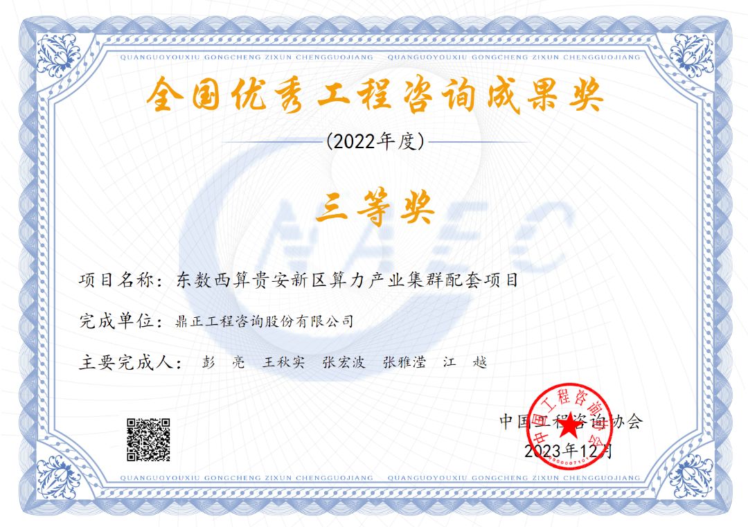 2023年12月29日,中國(guó)工程咨詢協(xié)會(huì)公布了“2022年度全國(guó)優(yōu)秀工程咨詢成果獎(jiǎng)”獲獎(jiǎng)項(xiàng)目名單,鼎正咨詢編制的《東數(shù)西算貴安新區(qū)算力立業(yè)集群配套項(xiàng)目》榮獲全國(guó)優(yōu)秀工程咨詢成果三等獎(jiǎng)。