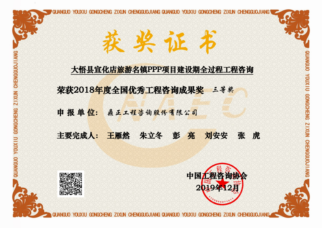 每?jī)赡暝u(píng)選一次,2018-2019年,我司大悟縣宣化店旅游名鎮(zhèn)建設(shè)PPP項(xiàng)目首獲“全國(guó)優(yōu)秀工程咨詢成果獎(jiǎng)”榮譽(yù);2020-2021年,我司武漢市江夏區(qū)清水入江PPP項(xiàng)目再獲該獎(jiǎng);2022-2023年,我司東數(shù)西算貴安新區(qū)算力立業(yè)集群配套項(xiàng)目第三次獲得此殊榮。
