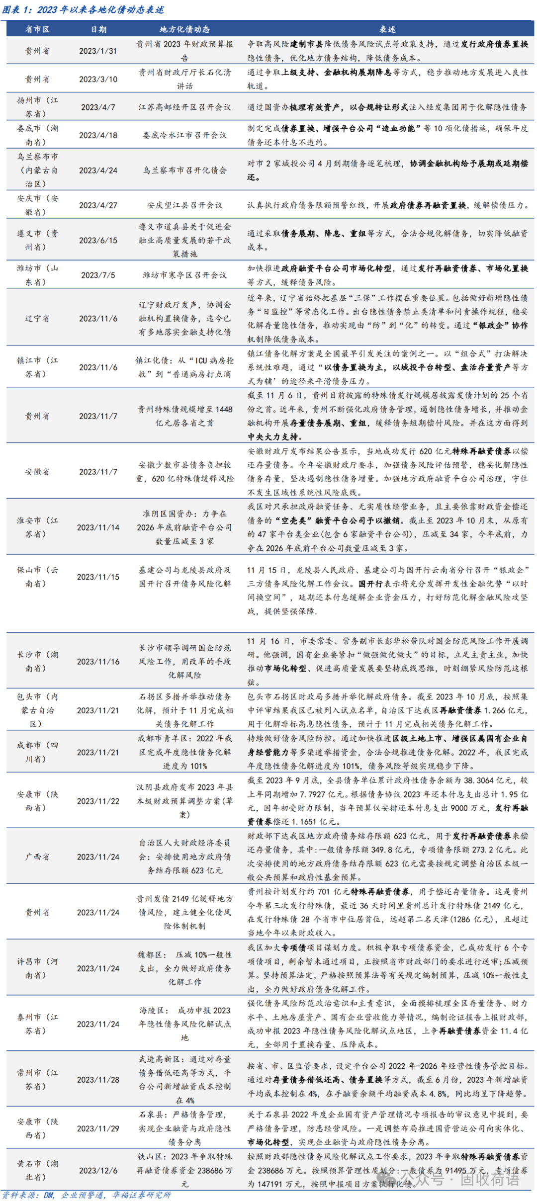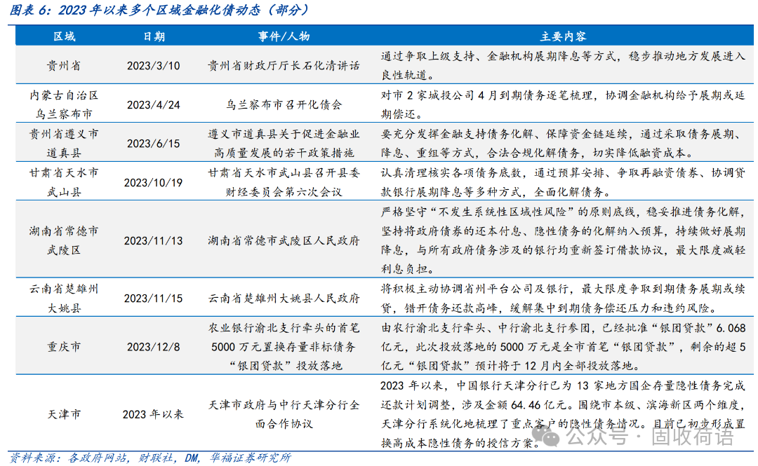 財政部《地方全口徑債務(wù)清查統(tǒng)計填報說明》中提出六種常見的債務(wù)化解舉措,具體為(1)安排財政資金償還;(2)出讓政府股權(quán)以及經(jīng)營性國有資產(chǎn)權(quán)益償還;(3)利用項目結(jié)轉(zhuǎn)資金、經(jīng)營收入償還;(4)合規(guī)轉(zhuǎn)化為企業(yè)經(jīng)營性債務(wù);(5)通過借新還舊、展期等方式償還;(6)采取破產(chǎn)重整或清算方式化解。同時,根據(jù)各地化債動態(tài)表述,各地根據(jù)自身情況,積極探索了金融機構(gòu)貸款置換、城投平臺整合或轉(zhuǎn)型、特殊再融資債置換、設(shè)立化債基金等方式推動化債進程。