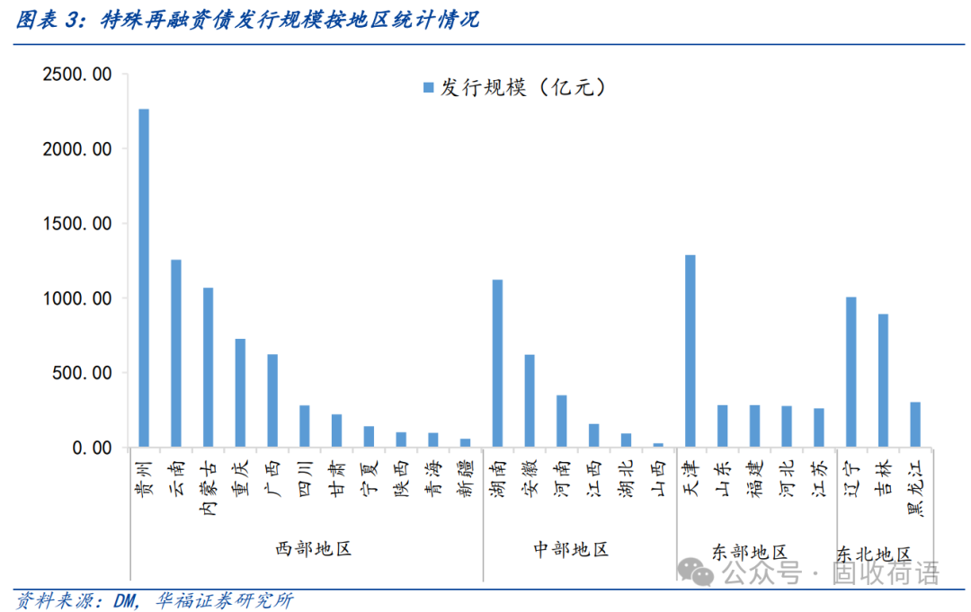 發(fā)行集中在西部地區(qū)。相較于東、中部地區(qū),西部地區(qū)整體綜合財力較弱,債務(wù)負擔較重,因此在上級支持方面存在較大優(yōu)勢。