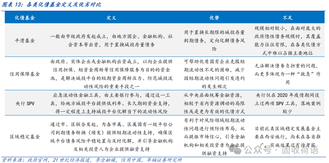 設(shè)立“化債基金”作為地方政府有效的管控城投債務(wù)風險的手段,被各地廣泛運用,包括平滑基金、信用保障基金、央行SPV等。基金資金主要來源于省內(nèi)/市內(nèi),調(diào)動的是區(qū)域內(nèi)的金融資源,但規(guī)模相對有限;SPV在投放貸款的同時或要求抵押品,因此國有資源更為豐富的區(qū)域預計將獲得更大的支持。