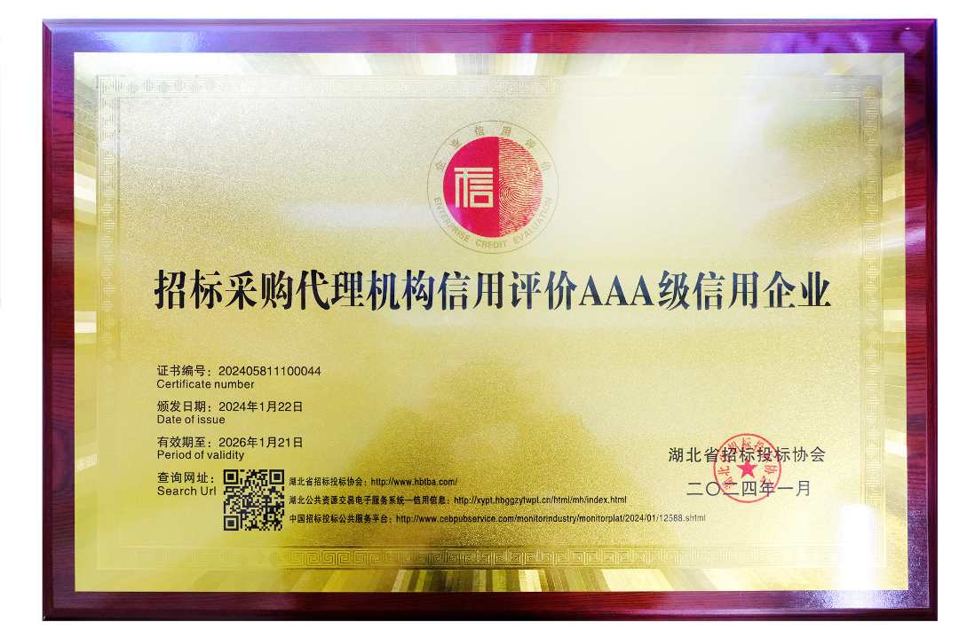 近日,鼎正憑借誠信的經(jīng)營理念、良好的企業(yè)信譽和優(yōu)質的服務質量,榮獲由湖北省招標投標協(xié)會認定的最高等級“招標采購代理機構信用評價AAA級信用企業(yè)”稱號。