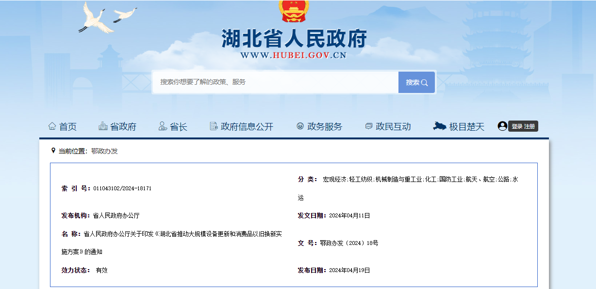 《湖北省推動大規模設備更新和消費品以舊換新實施方案》已經省人民政府同意,現印發給你們,請認真貫徹落實。2024年4月11日