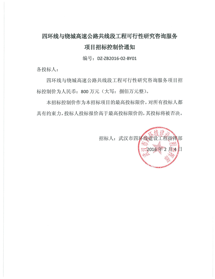 四環線與繞城高速公路共線段工程可行性研究咨詢服務項目招標控制價通知