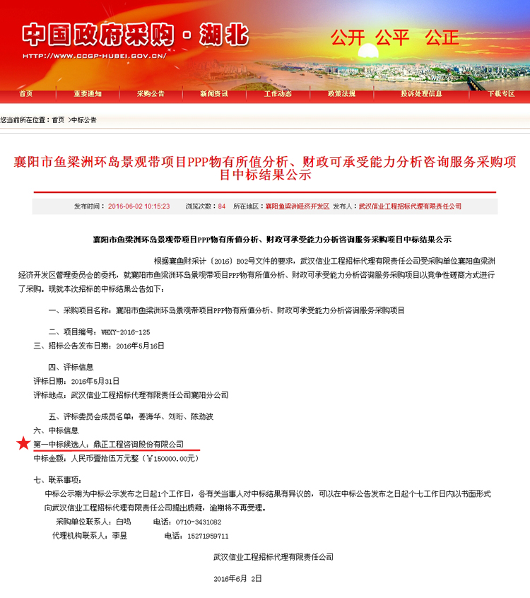 【經營成果】我司中標襄陽市魚梁洲環島景觀帶項目PPP物有所值分析、財政可承受能力分析咨詢服務?采購項目