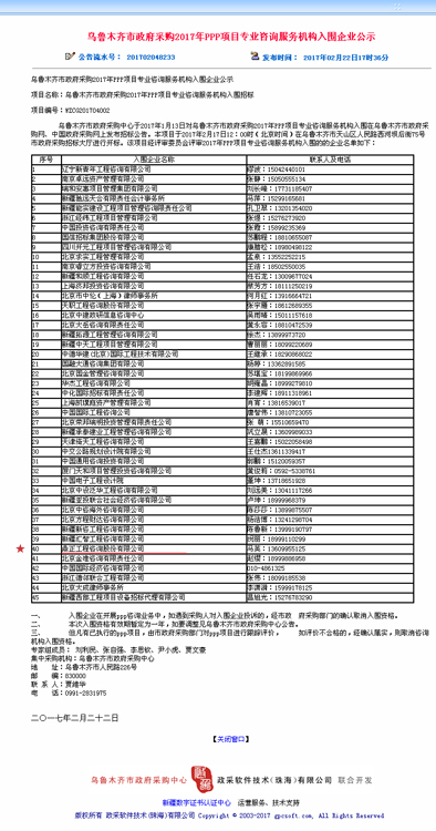【經營成果】我司成功入圍烏魯木齊市政府采購2017年PPP項目專業咨詢服務機構庫