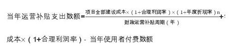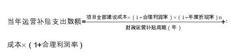 對可行性缺口補助模式的項目,在項目運營補貼期間,政府承擔(dān)部分直接付費責(zé)任。政府每年直接付費數(shù)額包括:社會資本方承擔(dān)的年均建設(shè)成本(折算成各年度現(xiàn)值)、年度運營成本和合理利潤,再減去每年使用者付費的數(shù)額。計算公式為:
