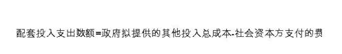 第二十二條 配套投入支出責(zé)任應(yīng)綜合考慮政府將提供的其他配套投入總成本和社會資本方為此支付的費用。配套投入支出責(zé)任中的土地等實物投入或無形資產(chǎn)投入,應(yīng)依法進行評估,合理確定價值。計算公式為: